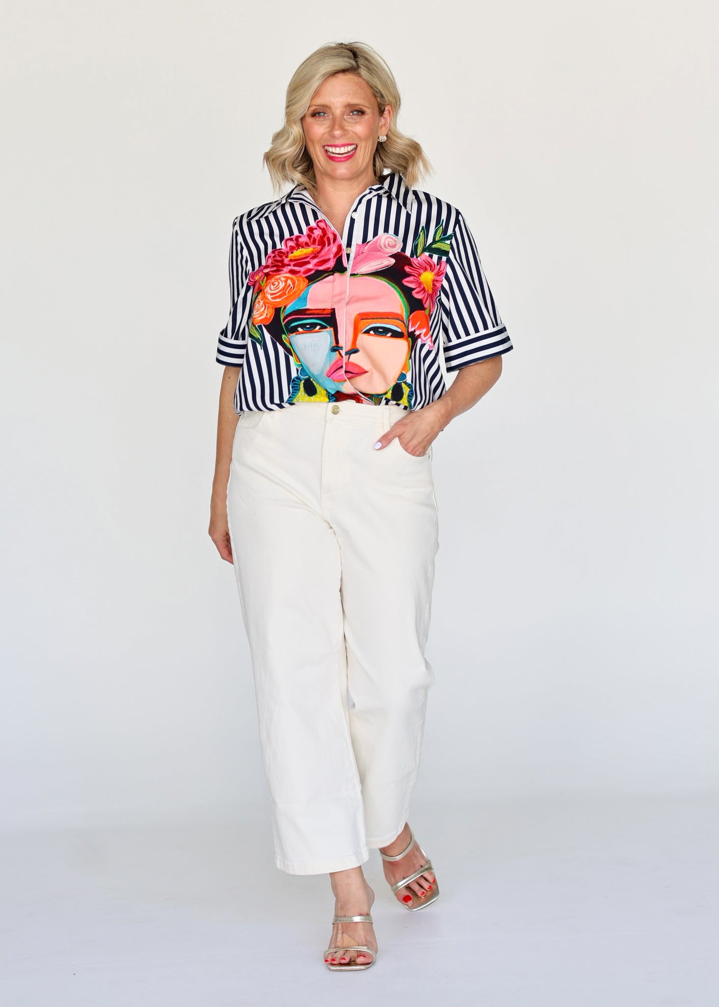 Front Pocket Stretch Wide Leg Jean - Mid Blue