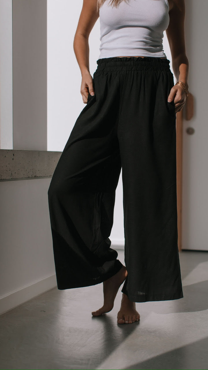 Shirred Waist Wide Leg Linen Pant - Black