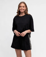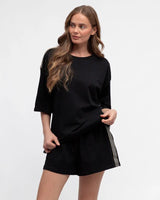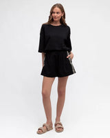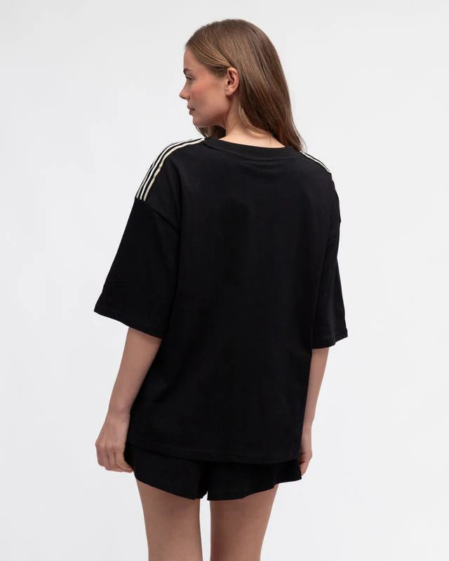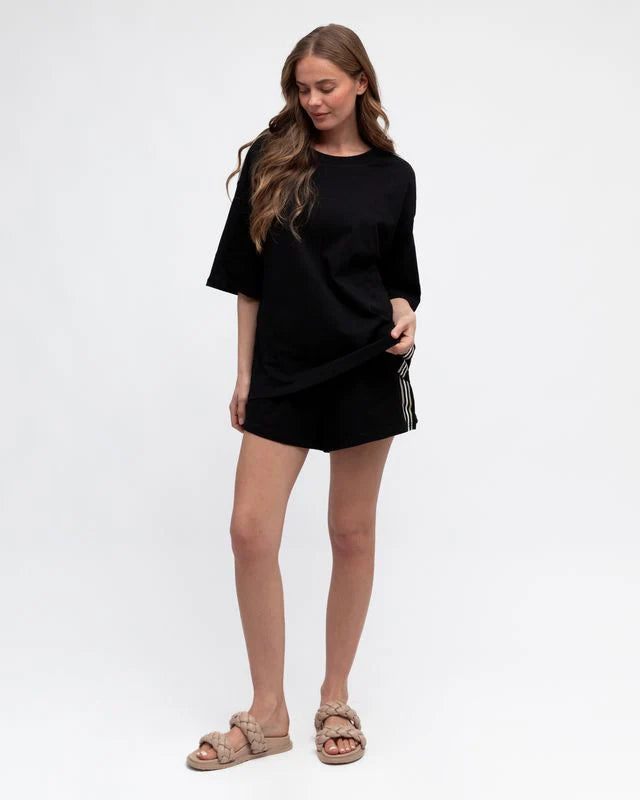 Love a classic black tee with a bit of edgy trim. Jazz up your tee shirt game with this gorg tee from Ebby & I. Luxe cotton black tee with side stripe trims to shoulders and sides.