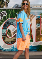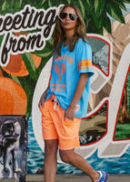New aqua retro sporty tee with bright orange prints and orange stripes on each sleeve.A great fitting basic tee in a beautiful 100% slub cotton jersey.