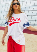 White slouchy tee Urban tee with LOVE in red on the front and navy stripes on each sleeve. Our standard over size fit, the same as our logo tees.