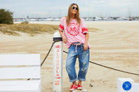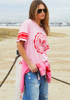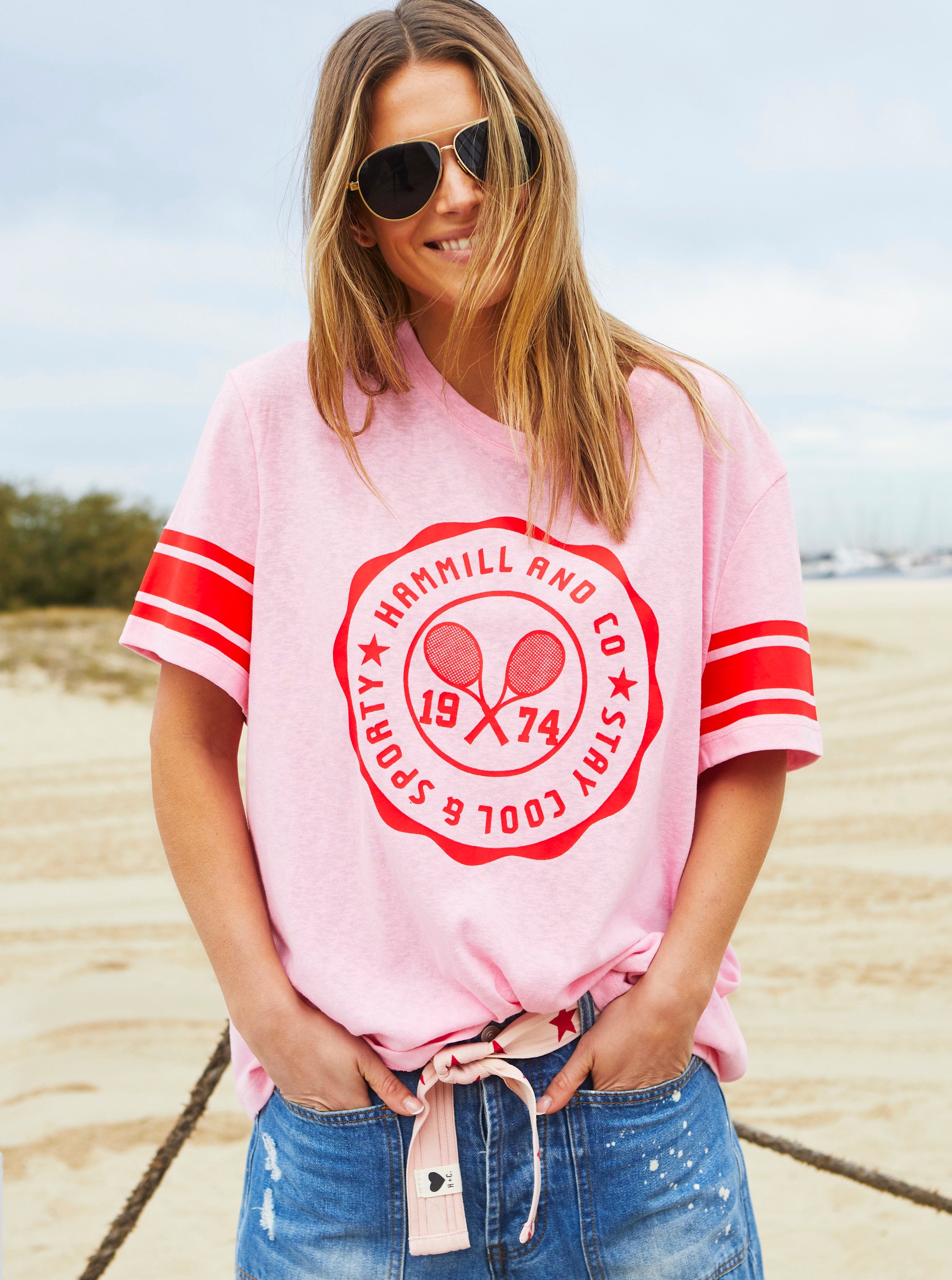 Slouchy crew neck tee in a soft pink slub jersey with red retro Tennis print on the front and stripes on each sleeve. Looks great worn back with denim shorts or jeans!