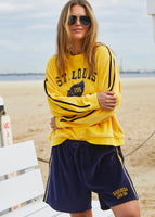 Our standard fitting sweat with rib neck & waistband. Navy St.Louis retro print on the front & double navy velour tape down each sleeve.
