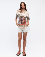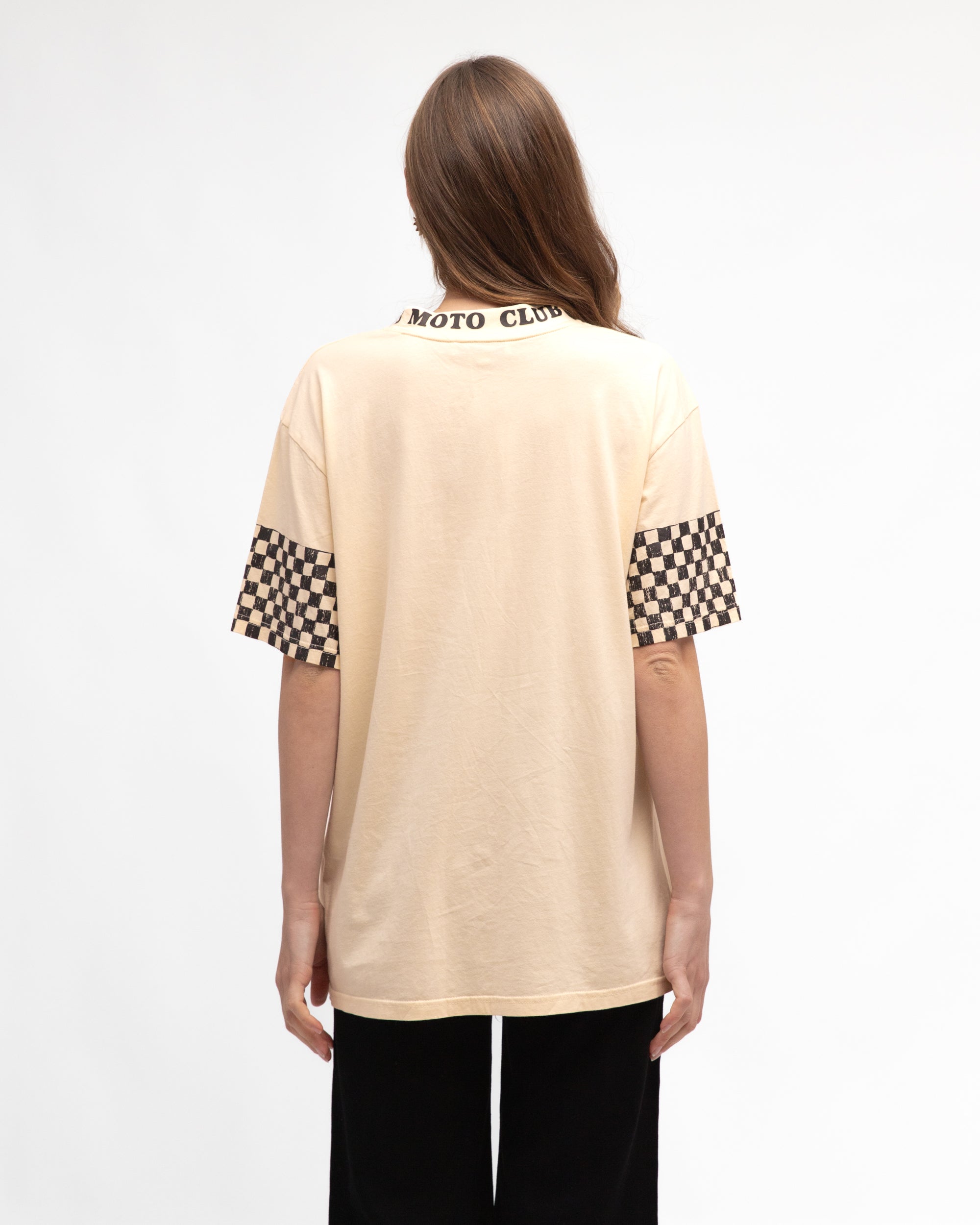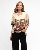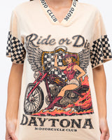 This Tee is super fab! You know we love a good tee & when we find one - its goes!! I think I am addicted to not only wearing cool tees, but finding them for you! Fabulous v neck tee with graphic daytona ride or die print to the front & cute checkered print to the sleeves. Also available in washed black.