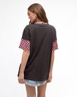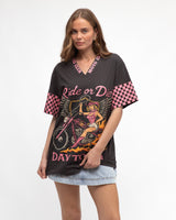 This Tee is super fab! You know we love a good tee & when we find one - its goes!! I think I am addicted to not only wearing cool tees, but finding them for you! Fabulous v neck tee with graphic daytona ride or die print to the front & cute checkered print to the sleeves. Also available in cream.