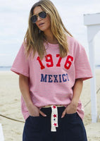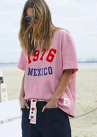 This tee is a total throwback in the best way. With fine red & white stripes and a pop of red & navy“1976 MEXICO” across the front, it’s giving vintage souvenir tee meets cool street style. The fit is oversized and relaxed — made for casual summer days.