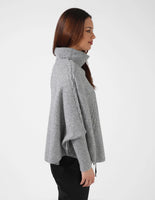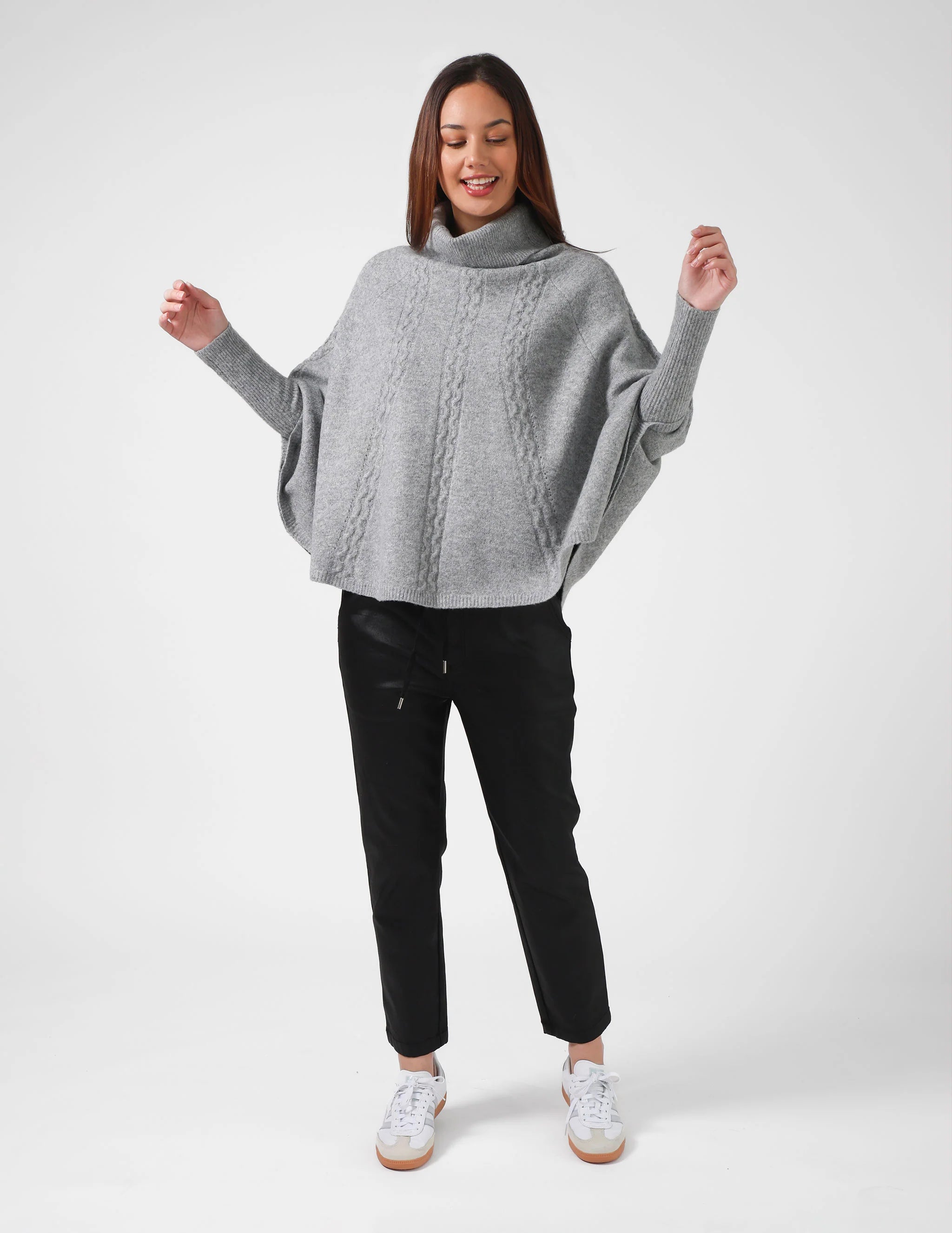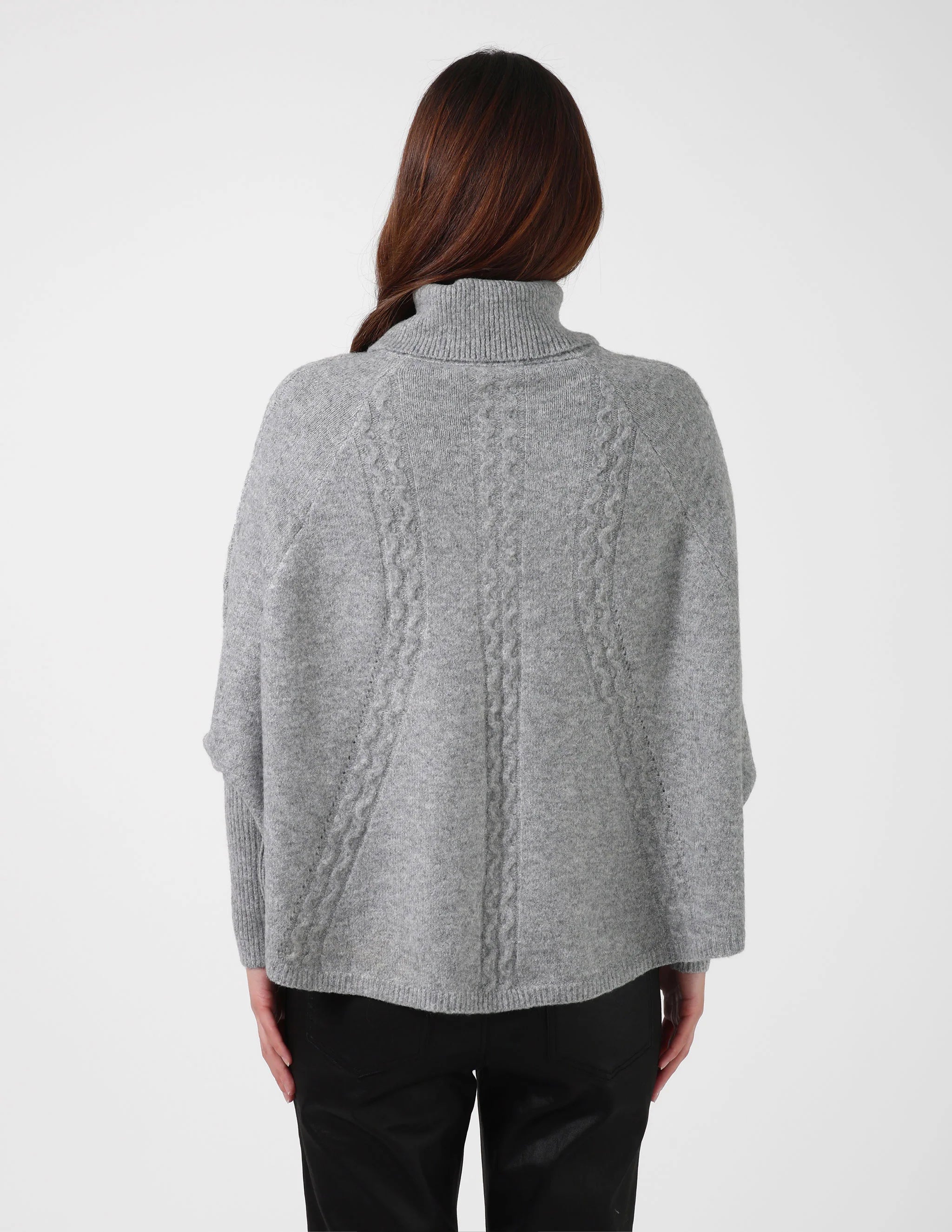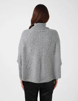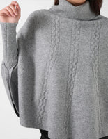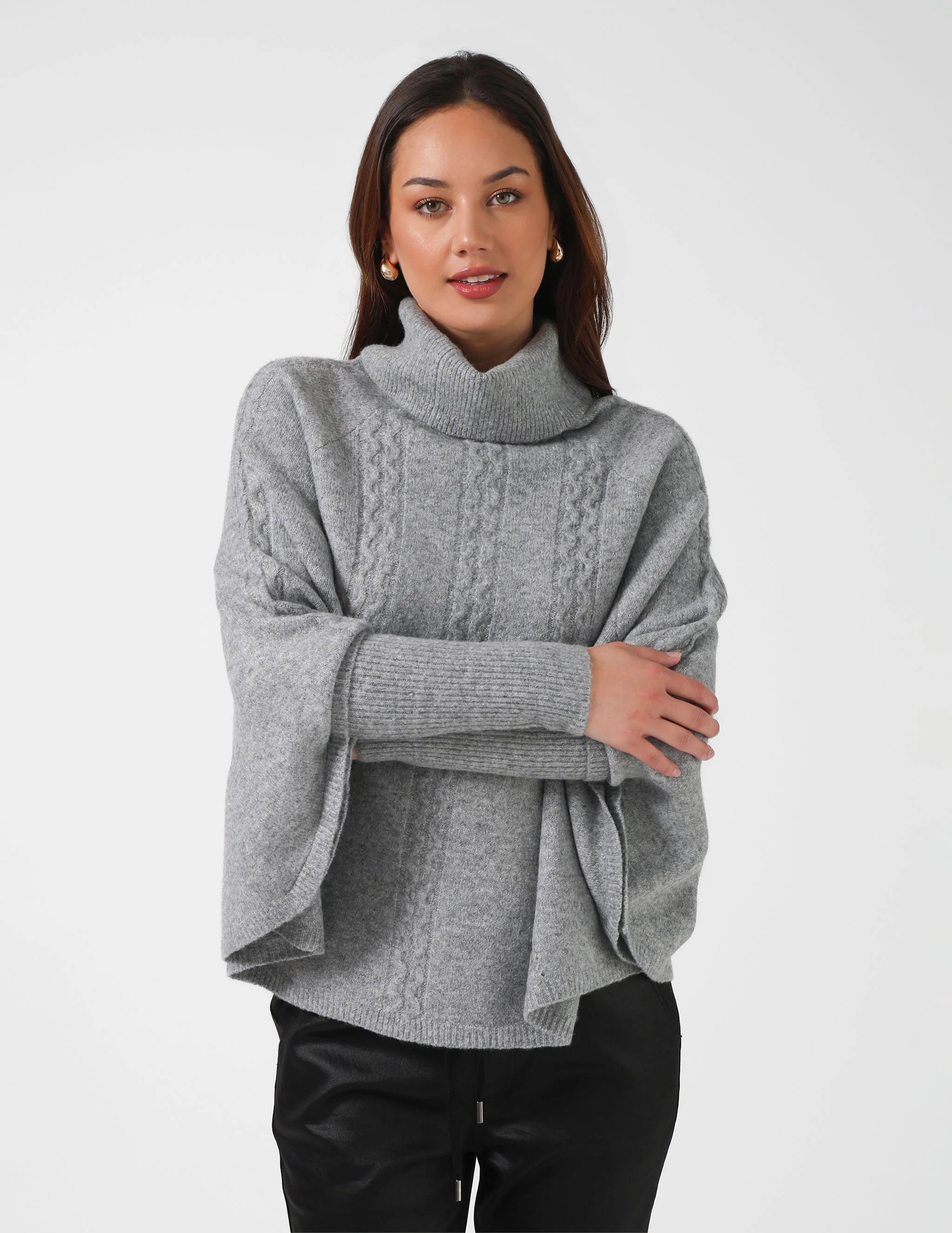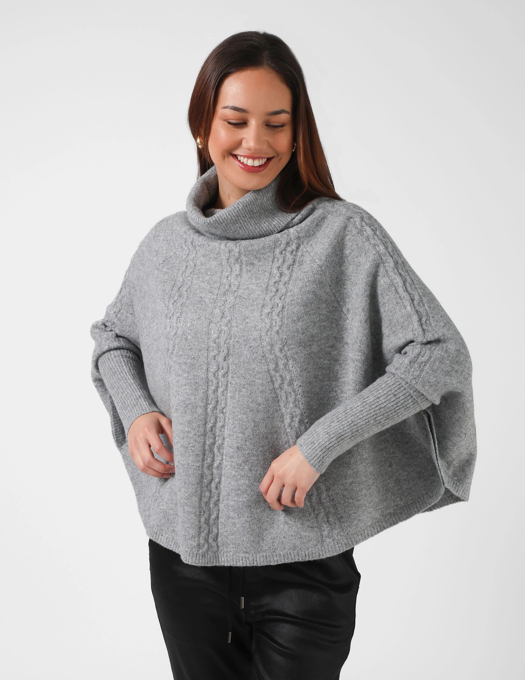 Cable knit curved hem poncho with rib rolled neckline and slim rib sleeves. Super comfy throw on - we love the sleeve ribbed detail.