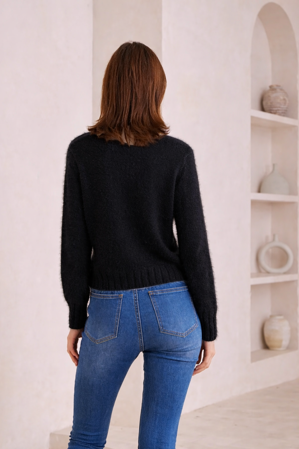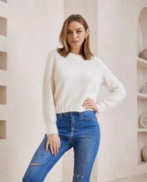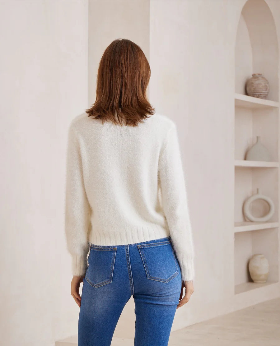 We are in love with the new fluffy sweaters from Iris Maxi. I love a sweater that sits well & is not too oversized. I would say its slightly cropped but not too short - it sits at just the right length. Love wearing this with high waisted jeans & over a dress. Its warm and snuggly. Simple round neck basic knit that just ticks all the right boxes. You will want this knit in every colour - its just that good.