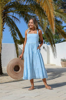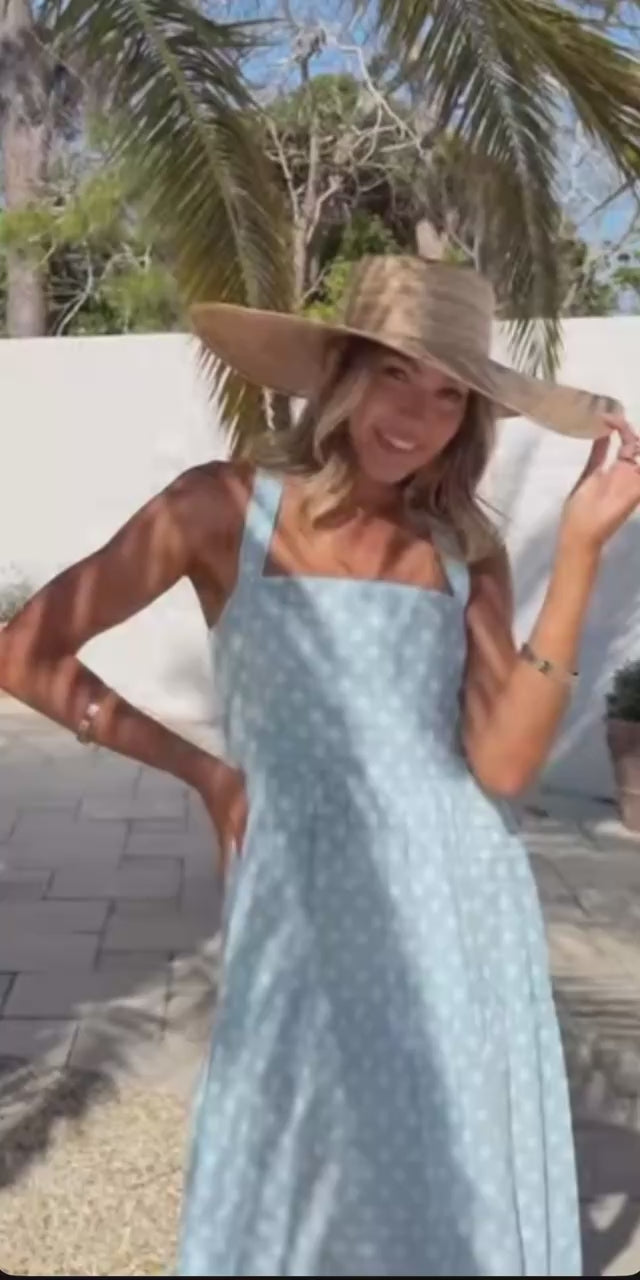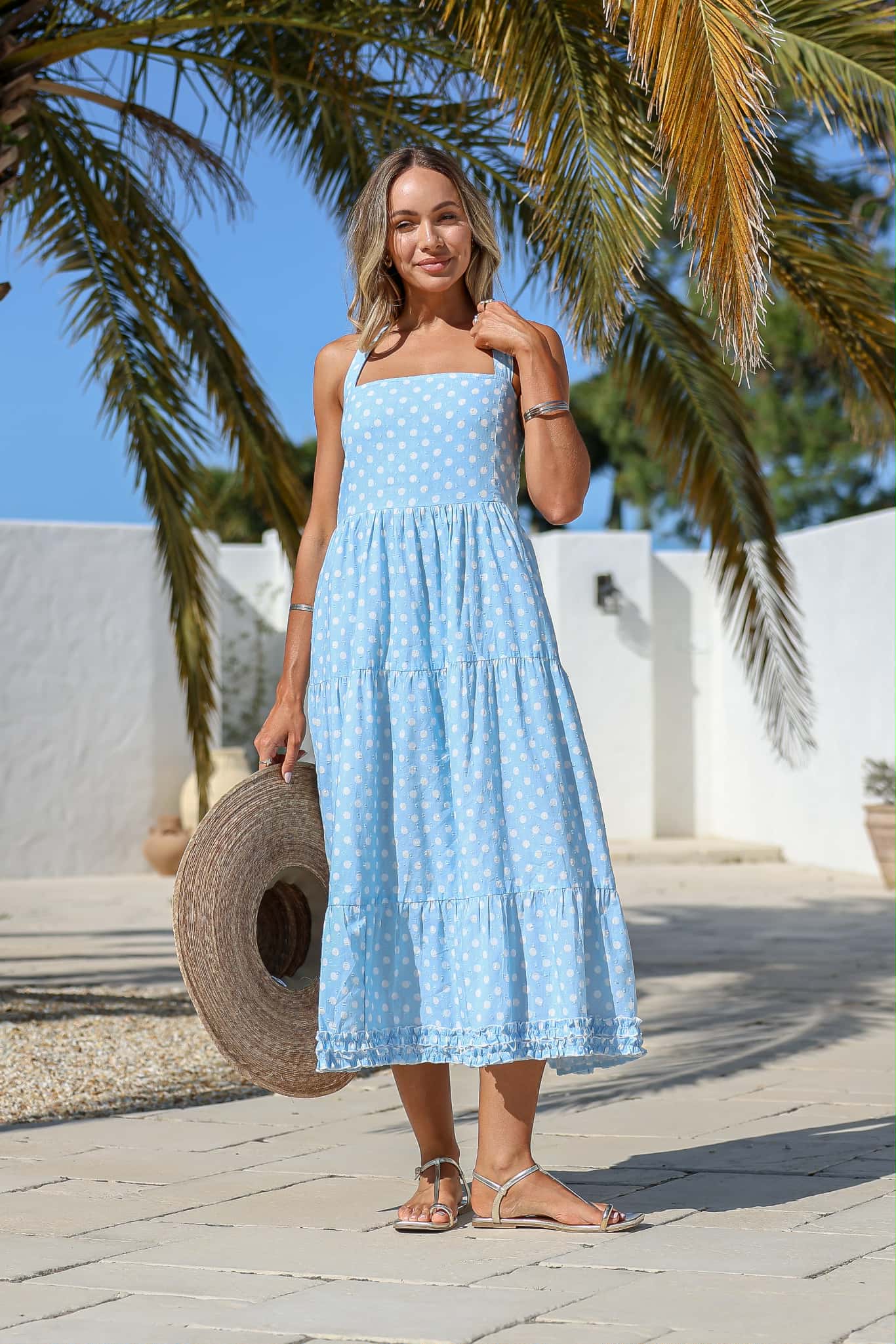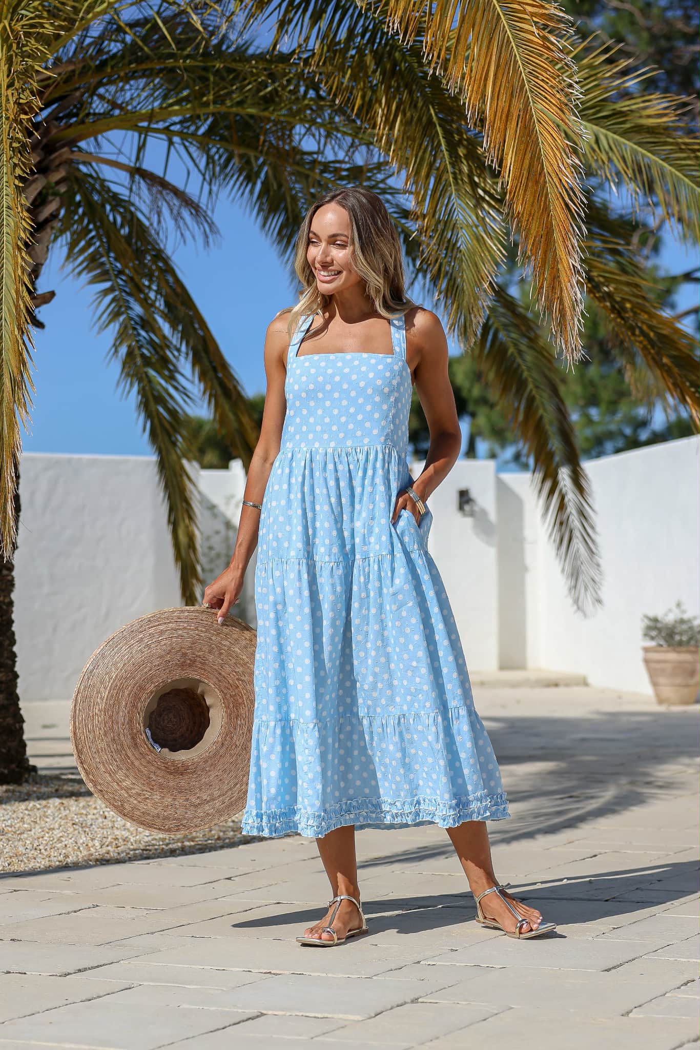Pretty baby blue polka dot dress. Love the ruffle hem & beautiful textured dobbie fabric. Cross back sundress with elastic to back. Fully lined dress with side pockets. Great for any occasion dressed up or down - she is just so pretty & we know you will love her xxx