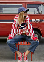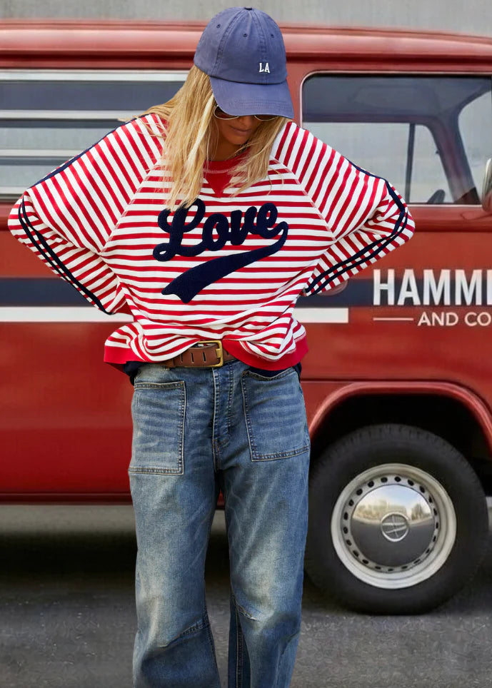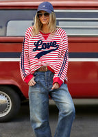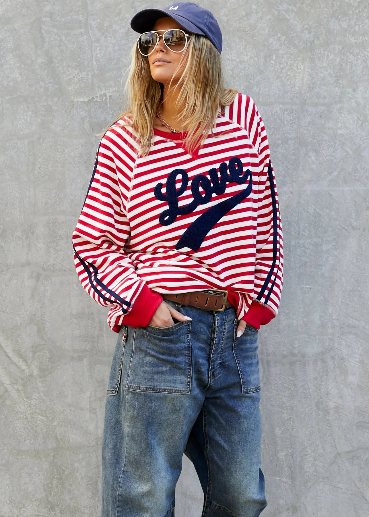 A college inspired sweat that combines comfort, sporty design with  LOVE in navy chenille on the front and two navy stripes down each sleeve. Contrast red rib on the collar, red cuffs and red cut rib waistband.