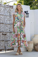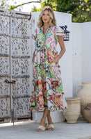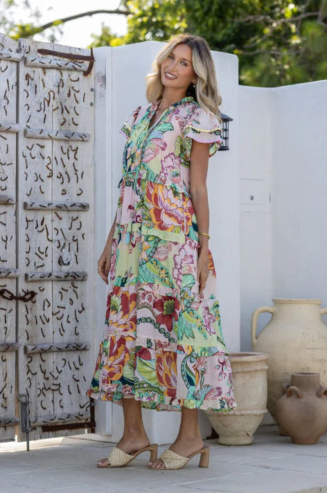 Absolute gorgeous dress! Beautiful pink green multi colourway - I just loved the trim & dobbie details that finish this dress to perfection - could not wait to receive this one & its even better in real life. Cute midi dress with pretty tiers & ruffle sleeves with gorgeous embroided trim, pockets to both sides & she comes with a pretty pink slip to wear underneath. You will love this dress.