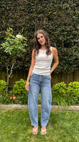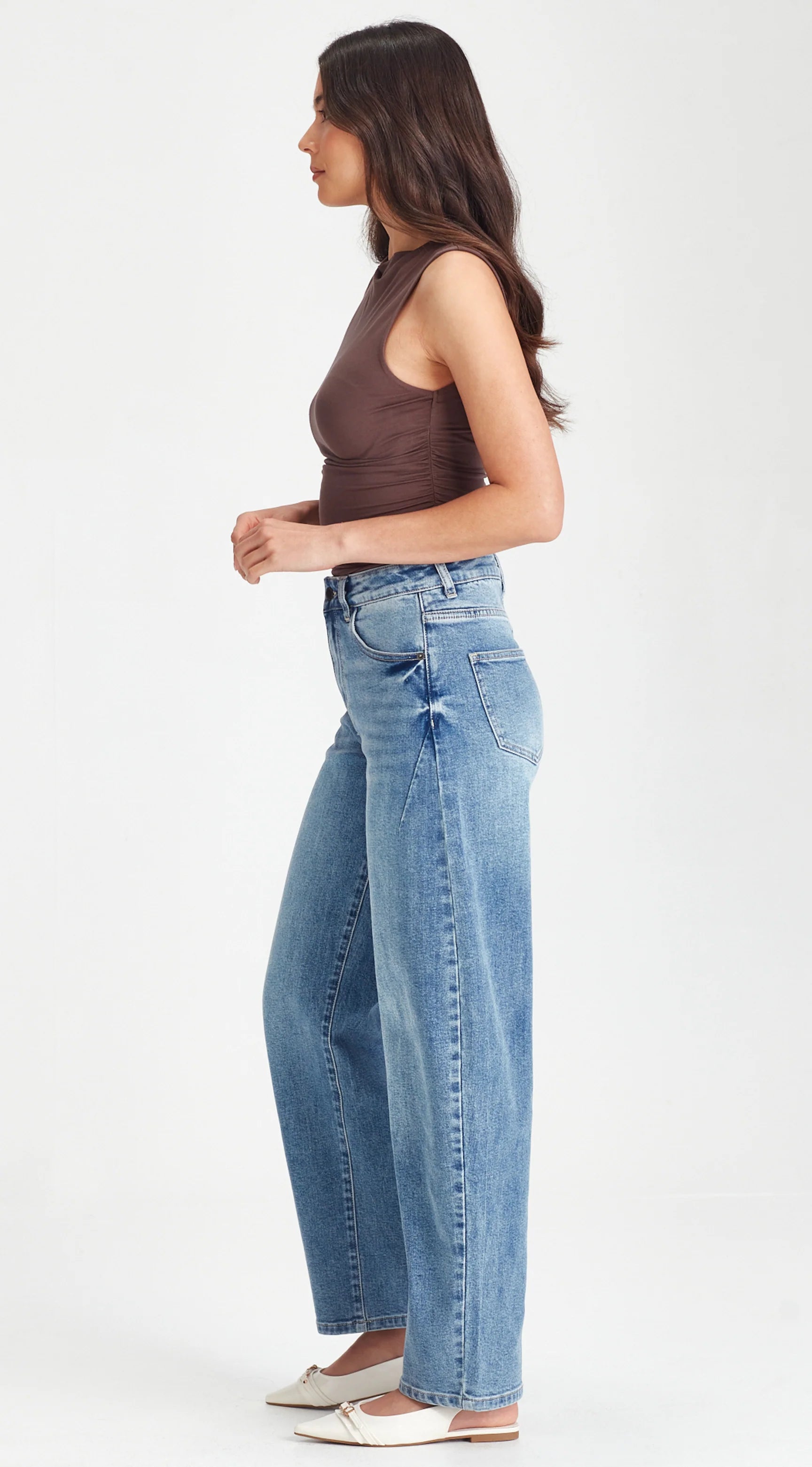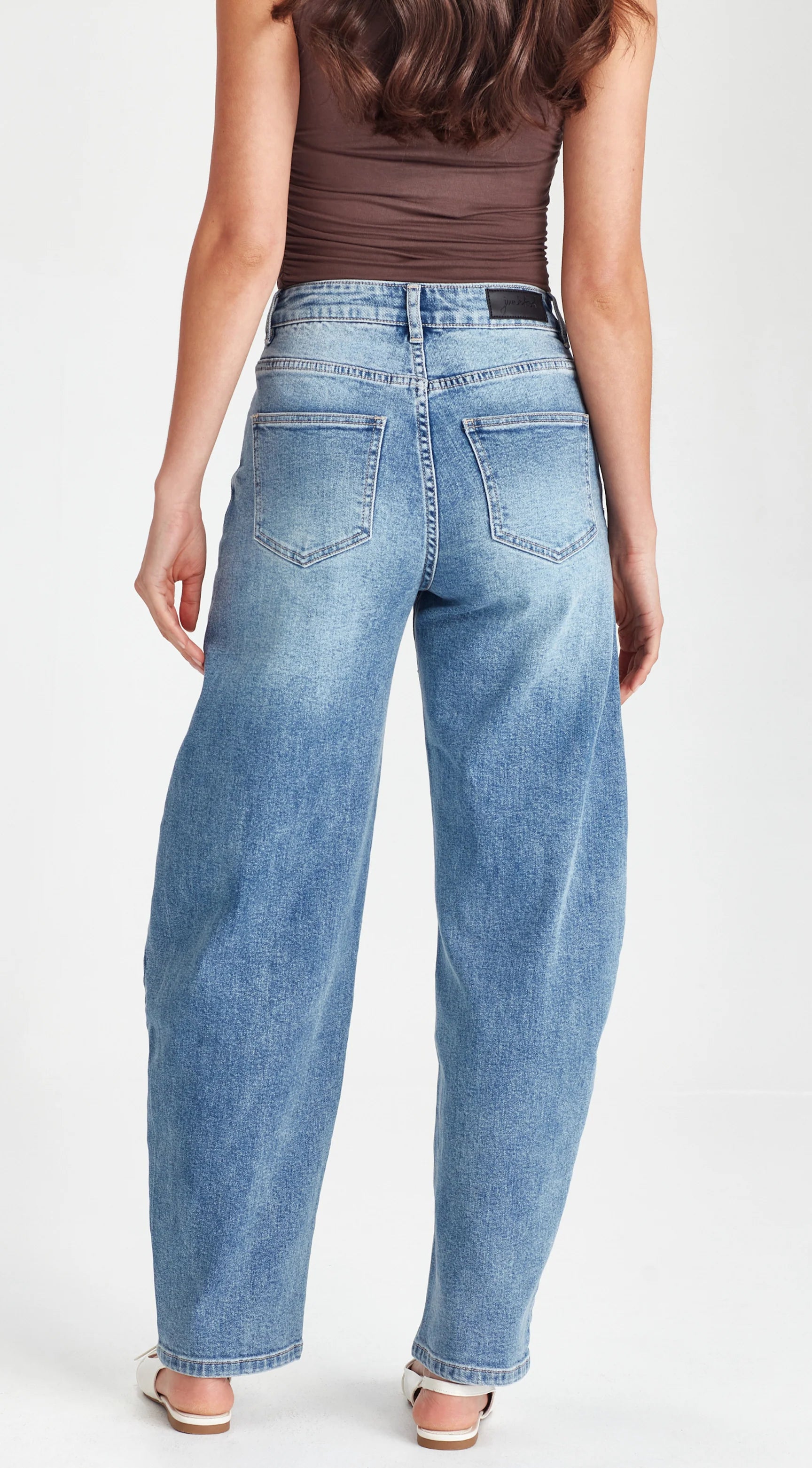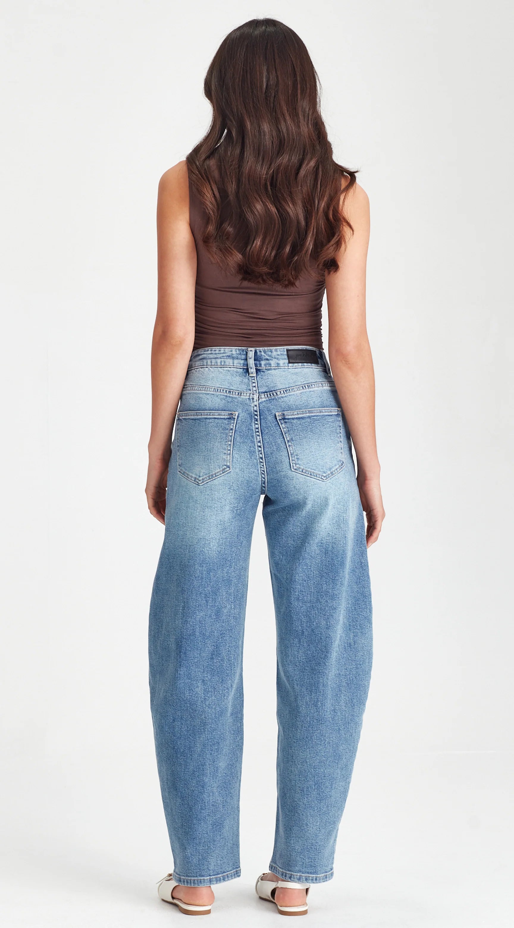 High rise with a flattering silhouette, Whiskey barrel fit jean fits slimmer to the waist & body with a relaxed barrel fit leg design. In a comfortable, soft stretch denim and in the perfect blue colour.